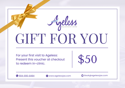 We have a special gift for you! Redeem this $50 gift card to use towards your first service at Ageless Rejuvenation Center!