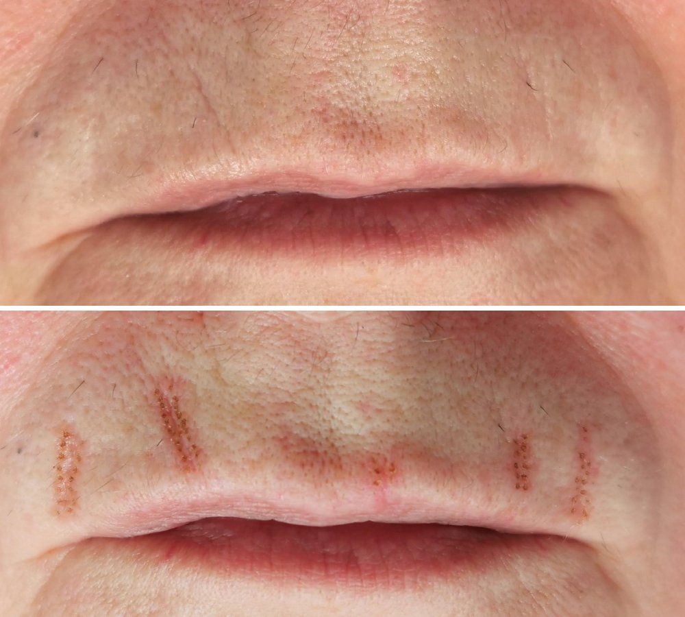 The procedure creates tiny brown carbon crusts or scabs in the treated area that persist for approximately one week before dropping off.